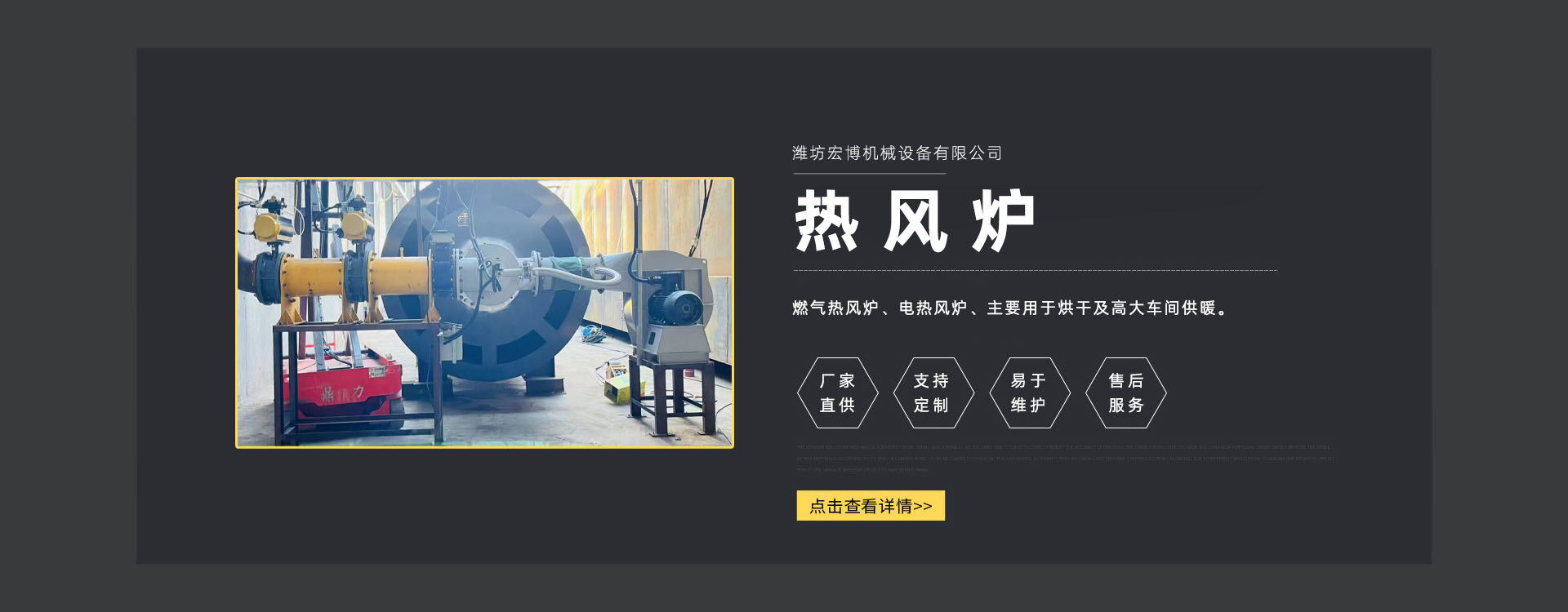 濰坊宏博機(jī)械設(shè)備有限公司是從事熱風(fēng)爐、烘干設(shè)備、供暖設(shè)備的研發(fā)、設(shè)計、制造和服務(wù)于一體的實體企業(yè)。長期以來,企業(yè)以市場的發(fā)展和客戶的需求為導(dǎo)向,集多年的生產(chǎn)技術(shù)與經(jīng)驗為一體,不斷開發(fā)和優(yōu)良產(chǎn)品。